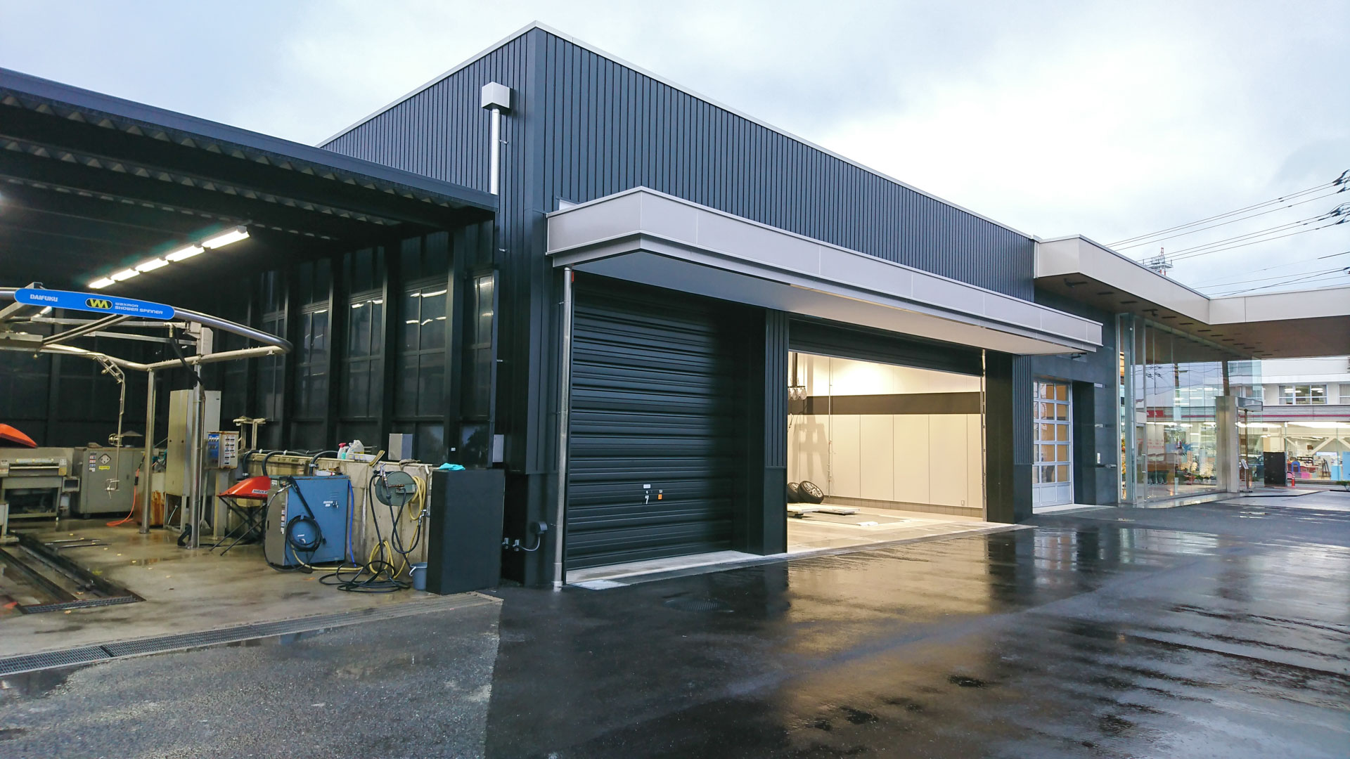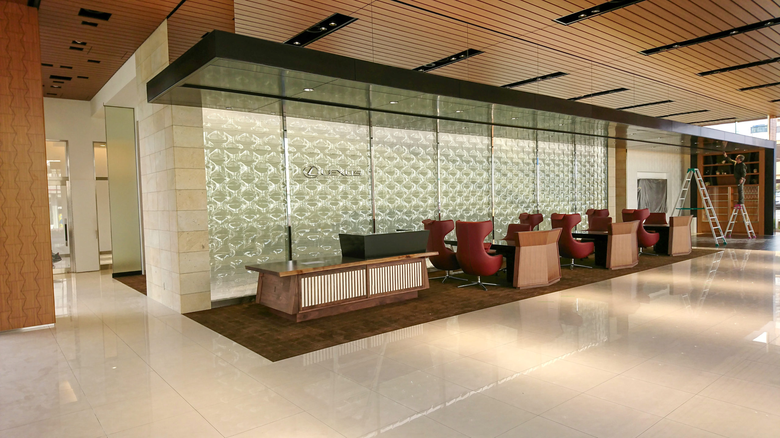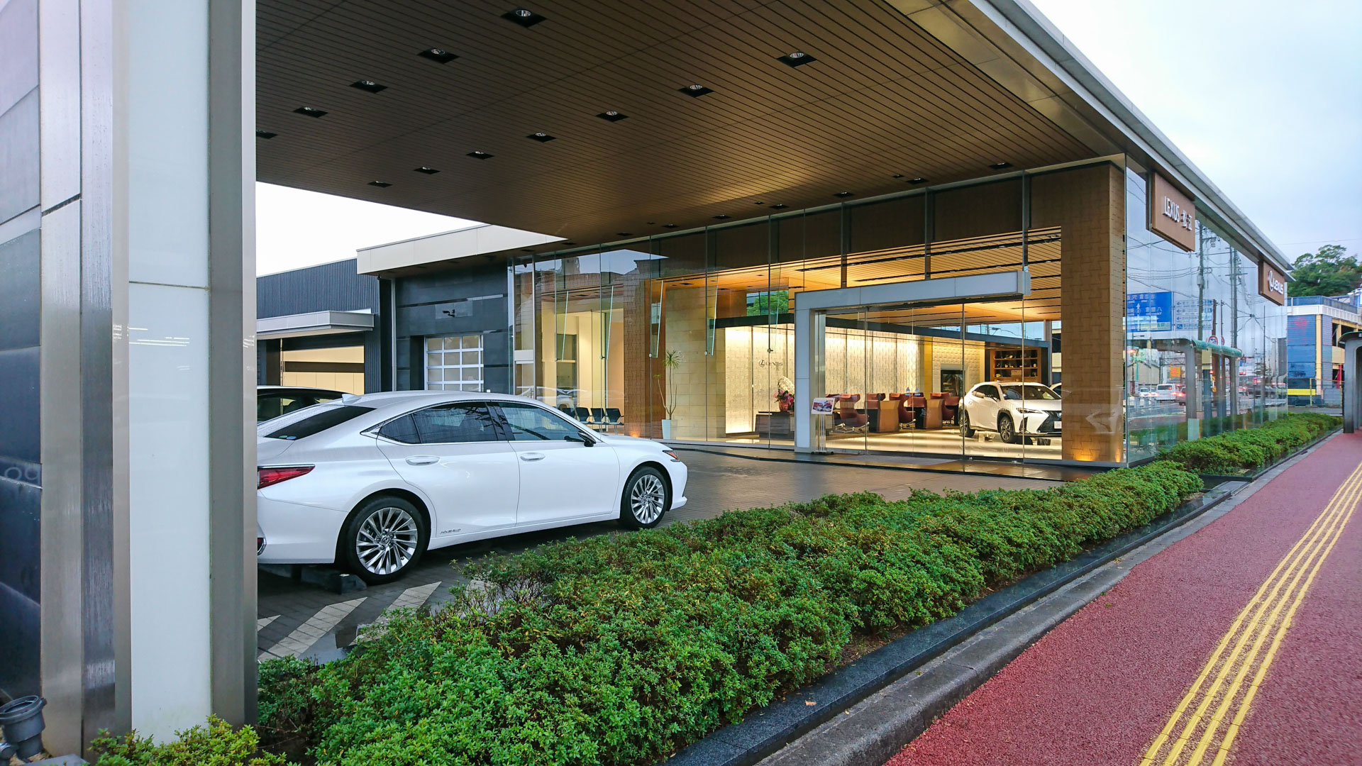 HomeWORKSレクサス松江リニューアル工事 レクサス松江リニューアル工事 レクサスの新店舗スタンダードに基づいた和モダンリニューアル スピンドルマークをモチーフとしてショールームの内装を一新。上質な素材をふんだんに使い、和モダンを基調とした新しいデザインに改装した。店舗の外観イメージを損なわないようサービス工場とバックヤードを増築し、機能性も高めた。 名 称: レクサス松江 所 在 地 : 島根県 松江市規 模: 地上1階建て構 造: 鉄骨造延床面積: 1,104㎡(増築後)用 途: 自動車ショールーム・整備工場竣 工: 2018(平成30年) 竣 工 図 : 今井産業株式会社 国道側外観 エントランス付近 増築サービス工場 ショールーム 受付周り オーナーズラウンジ オーナーズラウンジ サービスデスク 店舗 改修