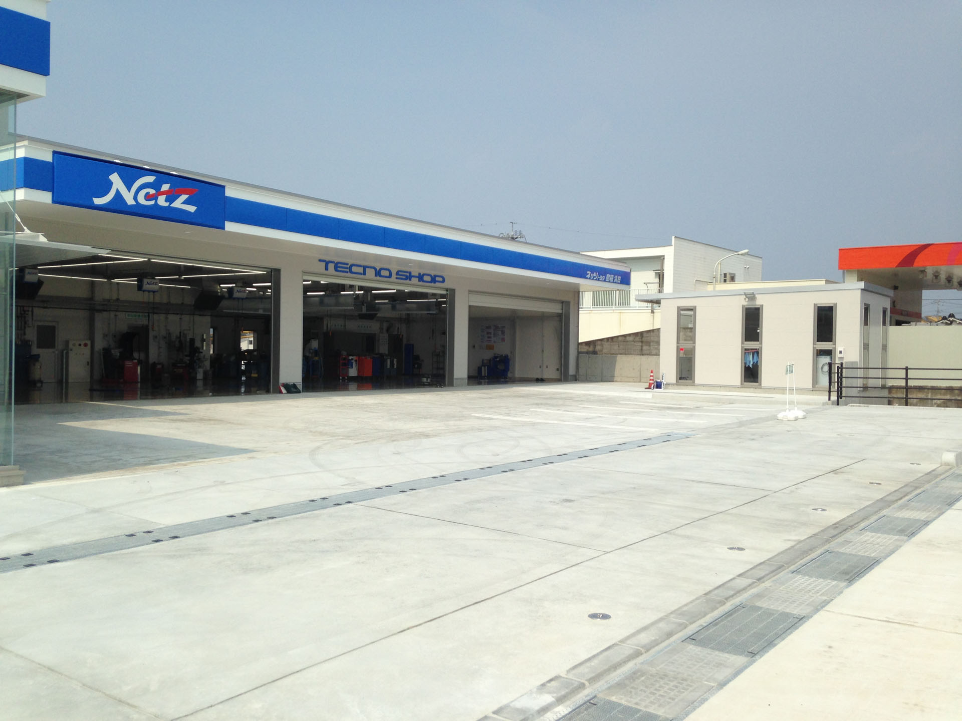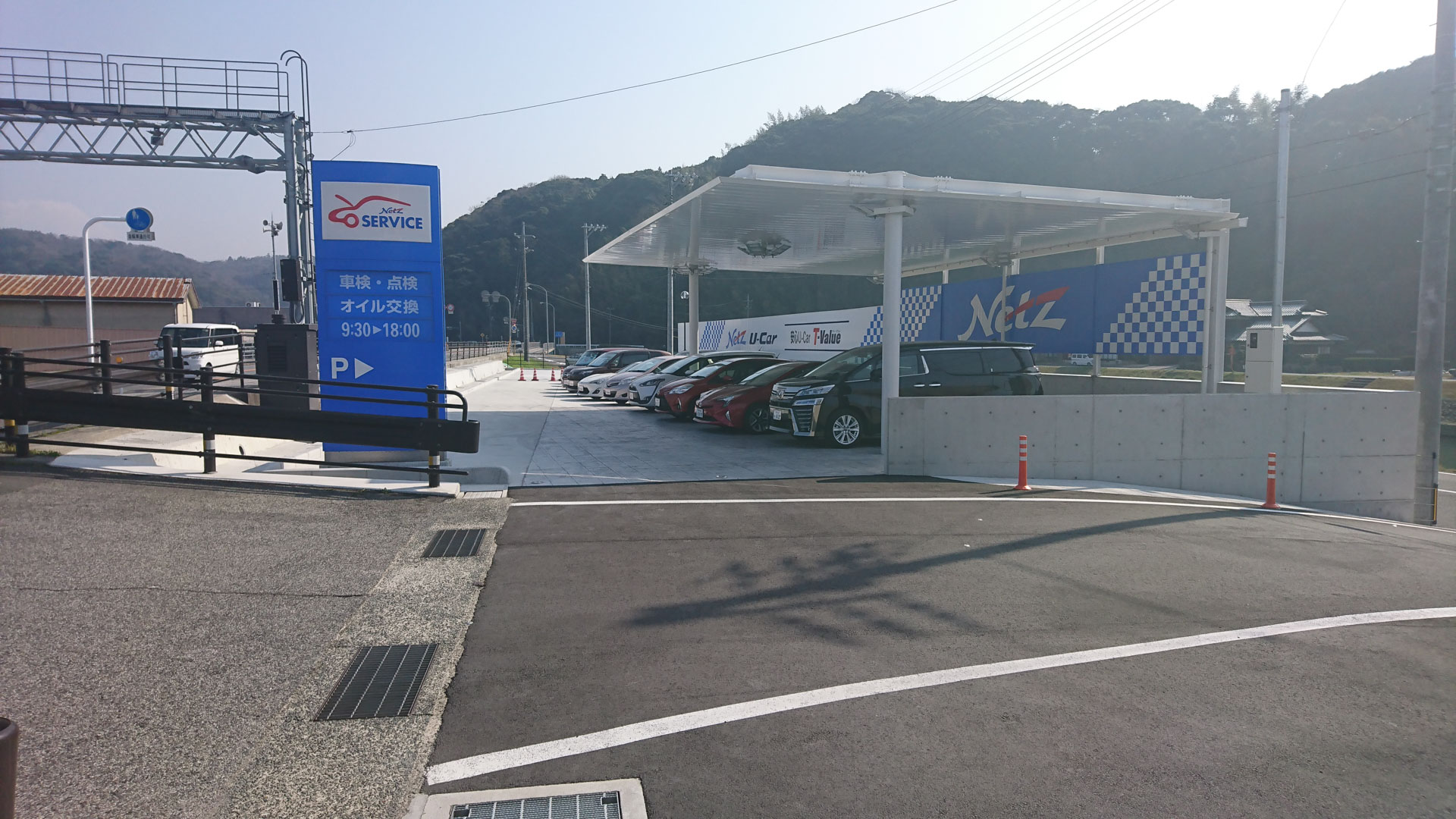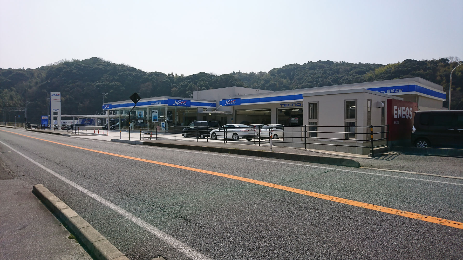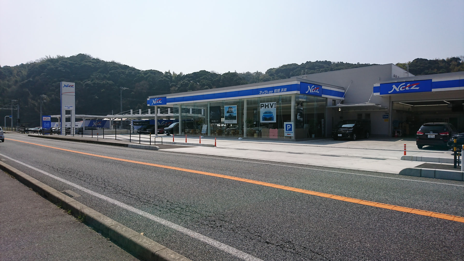 HomeWORKSネッツトヨタ島根浜田店 ネッツトヨタ島根浜田店 狭隘な河川沿い敷地を有効活用した3層構造の店舗 名 称: ネッツトヨタ島根浜田店所 在 地 : 島根県 浜田市規 模: 地上2階地下1階建て構 造: 鉄骨造延床面積: 本体棟1,884㎡, 洗車場棟27㎡, 屋外展示場121㎡用 途: 自動車ショールーム・整備工場竣 工: 2017(平成29年)施 工: 宮田建設工業(株) お客様駐車場〜エントランス付近 ショールーム・工場棟 9号線からの全景 人工地盤上のサービス工場と洗車場 屋外展示場別景 9号線からの敷地全景 店舗